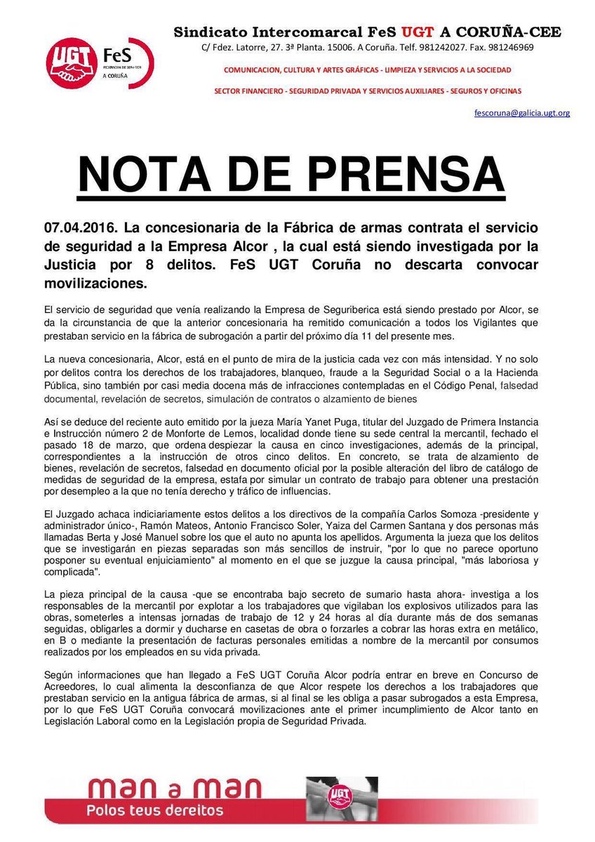 FeS Ugt Coruña convocarà movilizaciones si Alcor incumple la Legislacion Laboral o la de Seguridad Privada